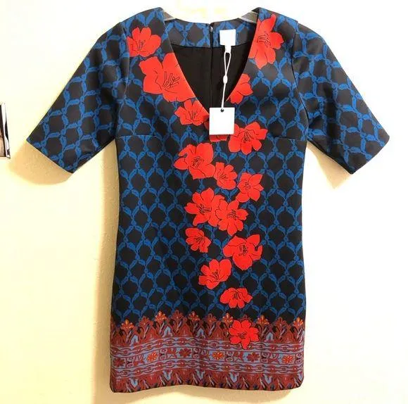 Tracy Reese Juana Trellis Border Red Hibiscus Floral dress 6 PtP 17” Length 34” This is a thick fabr... Show more