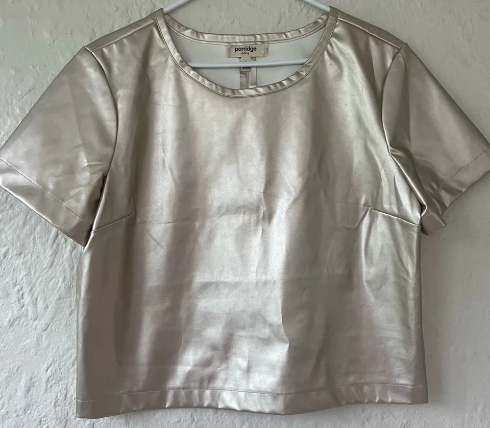 ANTHROPOLOGIE Porridge Boxy Cut Faux Leather Short Sleeve Top Metallic Gold, Side Bottom Zip; size L... Show more