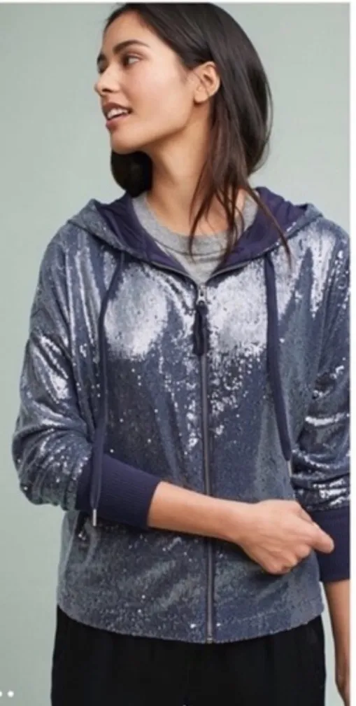 Shine in style with the Anthropologie Blue Sequined Zip-Up Hoodie. Perfect for adding a touch of gla... Show more