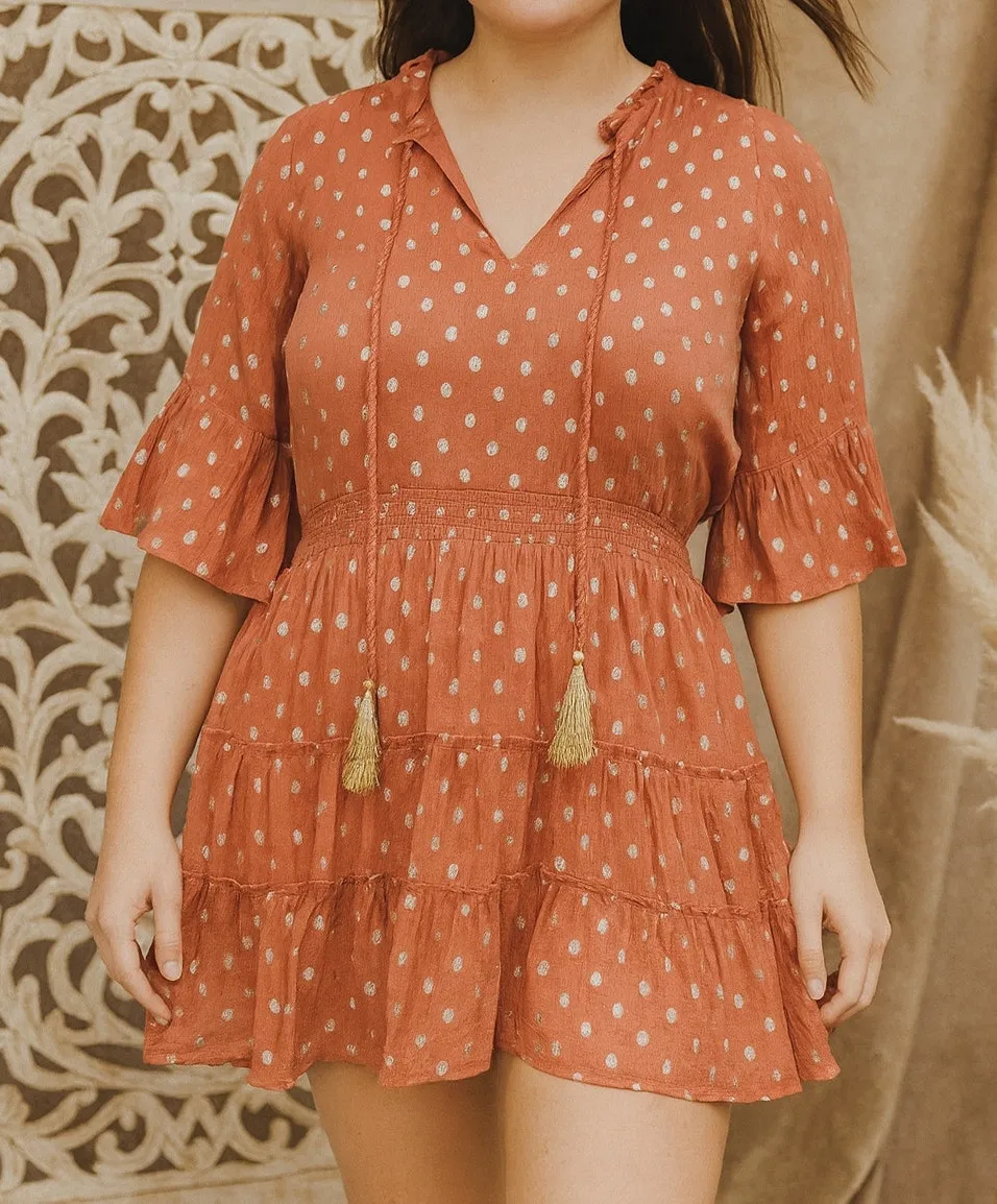 NWT Anthropologie Raga Kenna Polka Dot Tiered Mini Dress Dusty Pink Metallic S Chic and stylish rus... Show more