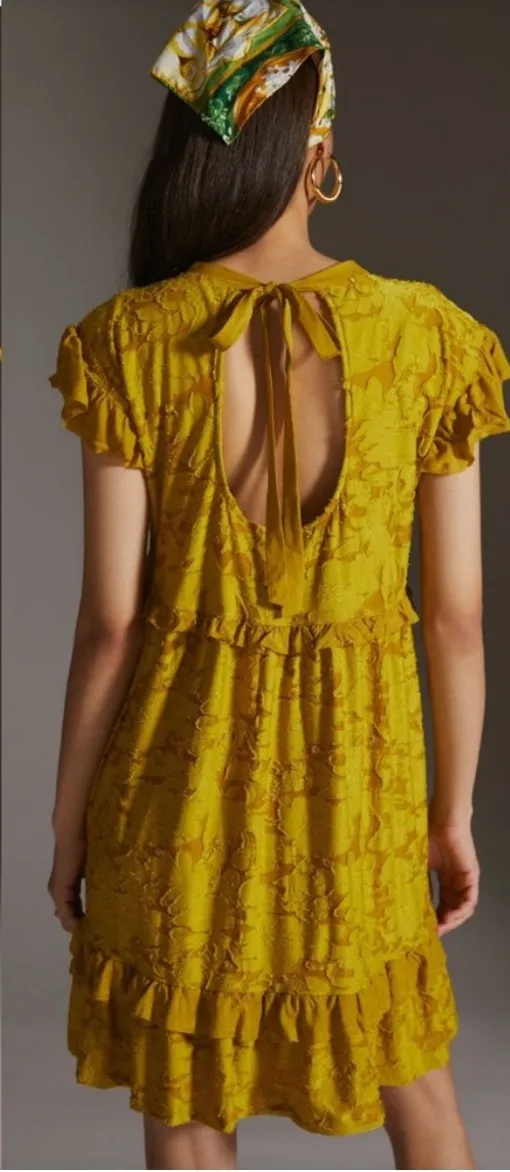 Anthropologie Ruffle Knit Mini Dress Mustard Yellow XS / X-Small Open Back Short Sleeve Measure... Show more