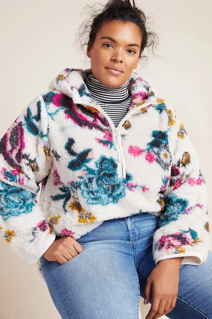 Cozy fleece quarter zip teddy hoodie with vibrant floral design. Features a mix of blue, pink, and yellow flowers on a cream background. Large comfy hood. Fully lined pockets and inside. Velvet ribbon zip pull. Excellent preowned condition. No holes or stains and smoke free. No matting as is common with teddy jackets. There may be a few pills forming here and there but otherwise it’s in fabulous shape! Women’s small. 20 inches pit to pit 25 inches long 16 inches shoulder to shoulder 23 inch sleeve #saturdaysunday #anthropologie #fluffy #teddy #sherpa #cozy #floral #oversized #roses #feminine #boho #indie #casual #hoodie #pullover #cottagecore #gardengirl #cabincore #winter #fuzzy #chunky #girlhoodcore #college #coastalgrandma #coastalcowgirl