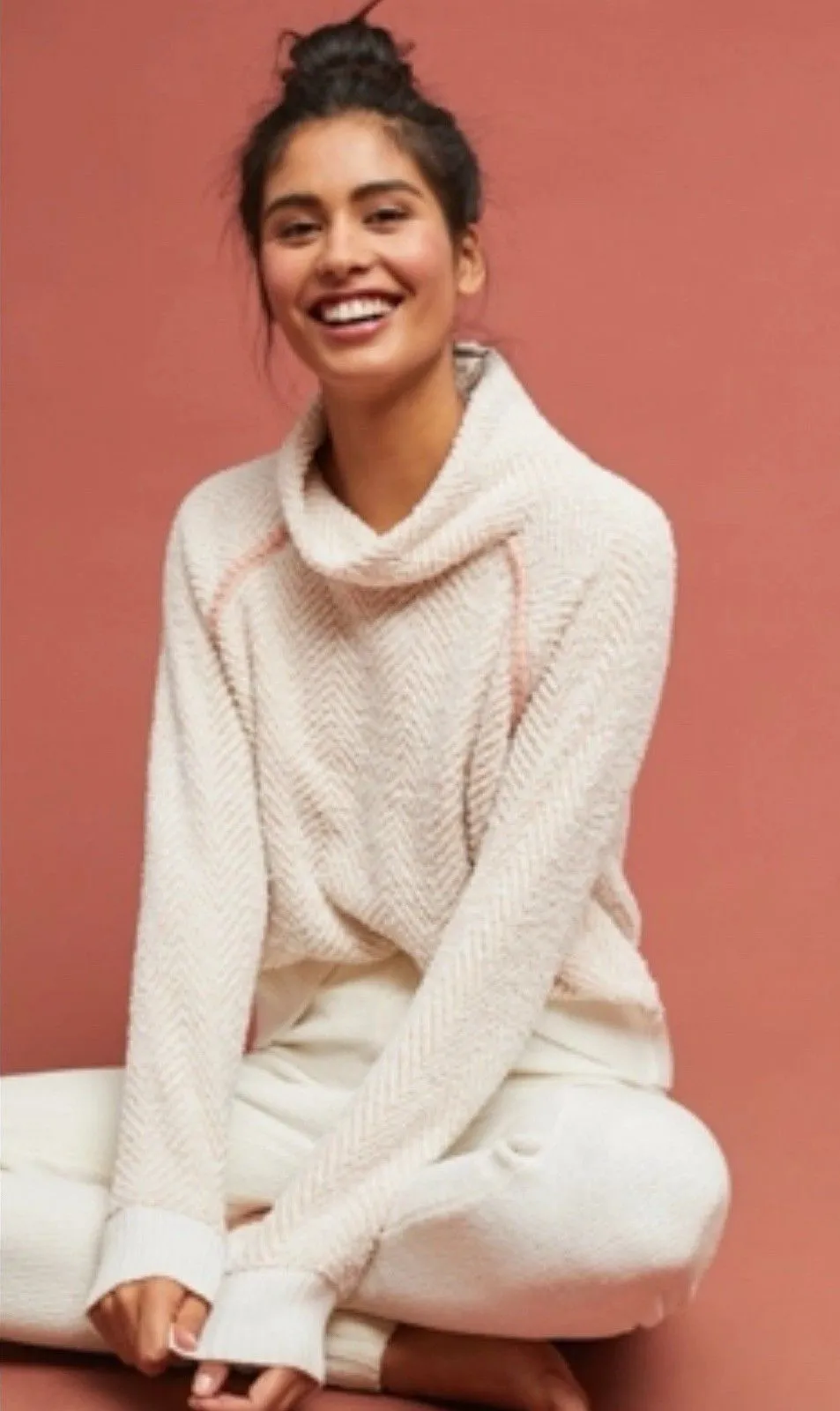 The Anthropologie Saturday Sunday XL Cowl Neck Sweater in Textured Chevron Cream Pink is a luxurious... Show more