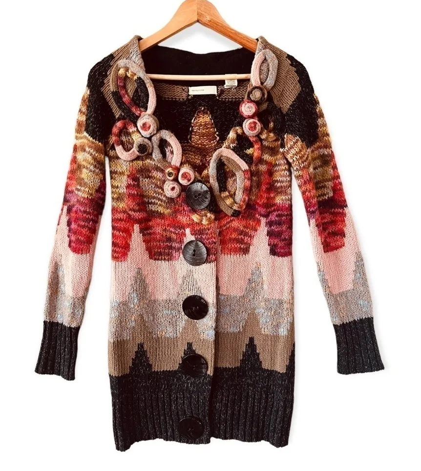 Button Down Cardigan 5 Large Buttons 3D Floral Knots Gorgeous Colors Super Cozy Excellent Condition... Show more