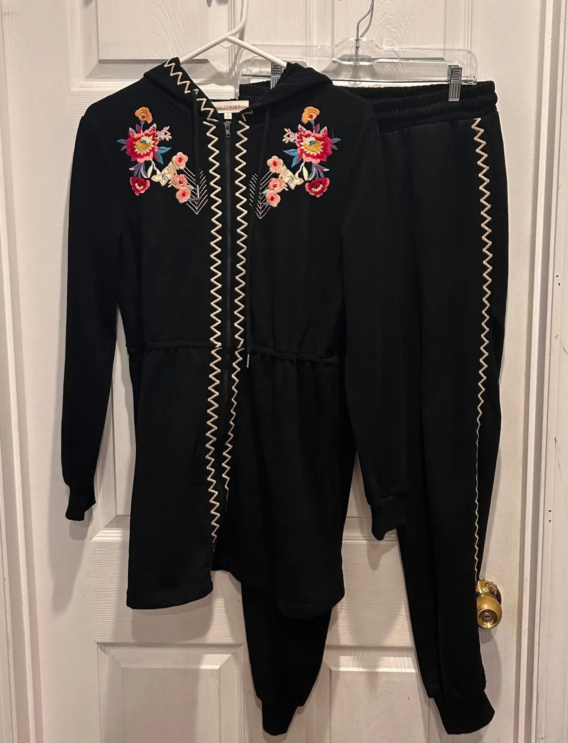 EUC. No rips or stains. Embroidered. Pockets on jacket and pants. Jacket UA to UA 20" Length 30" Pants Waist 15" Inseam 29" Measured flat and approximate Color: Black Department: Women Type: Outfit/Set Set Includes: Hoodie, Pants Fabric Type: Fleece Performance/Activity: Walking, Running & Jogging, Gym & Training, Yoga, Pilates Style: Sweatsuit Material: Cotton Blend, Spandex, Polyester Number of Pieces: 2 Piece Pattern: Floral Occasion: Casual, Activewear, Travel Keywords: Solitaire, Womens, Hoodie, Jogger Pants, Set, Loungewear, Black, Floral, Embroidered, Activewear, Casual, Comfort, Matching Set, Sweat Suit