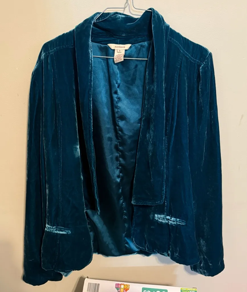 Luxurious teal velvet blazer. Perfect for stylish occasions. Soft texture and elegant design. EUC wi... Show more