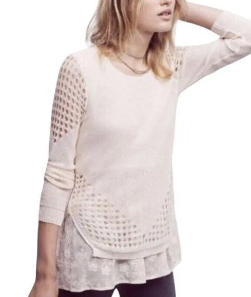 Anthropologie Sunday In Brooklyn Fiona Sweater Eyelet Layered Cream Medium wear at back necklin... Show more