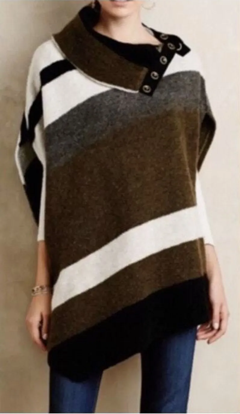 Embrace the cozy elegance of autumn with this stunning Tabitha Anthropologie wool poncho sweater. Crafted from high-quality wool, this piece exudes warmth and sophistication. Measurements: Size Medium Armpit to Armpit: 31" Material: Wool, Polyester, Acrylic Features: - Colorblock design - Striped pattern - Cowl neck - Snap button at neckline - Pullover style lagenlook, nortic, boxy, casual, warm, cozy, comfy, winter, outdoor, modern