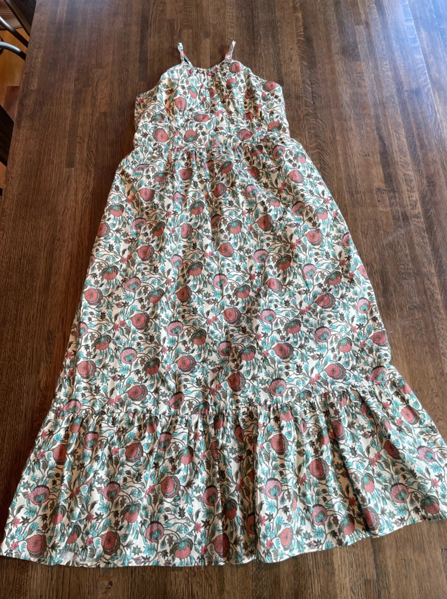 Excellent Condition Halter Top - Ruffle at Bottom of dress Cream with green, teal, pink flowers POCKETS!! 100% Cotton Halter with adjustable straps in the back. Elastic in back of dress.