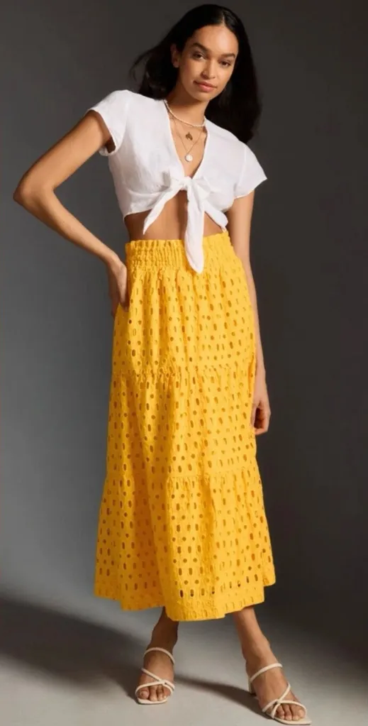 Size S EUC Bright and breezy maxi skirt featuring a vibrant yellow eyelet fabric with tiered detail.... Show more