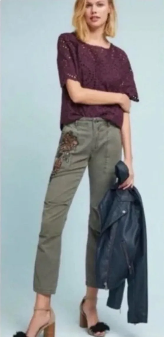 Anthropologie The wanderer Olive Chino beaded embroidery linen pants, size 28 Green - $49 - From Maria