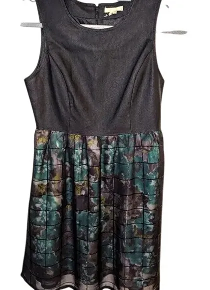 This beautiful sleeveless dress by Tulle features a flattering fit-and-flare silhouette. The top is a solid black textured bodice with light sheen, while the skirt contrasts in a vibrant floral print overlayed with a subtle grid pattern. The skirt has a black mesh overlay with floral print lining underneath in hues of green, turquoise, yellow, black, and white. Back zipper closure, fully lined, and perfect for parties or casual chic looks. Style no: IT60064.