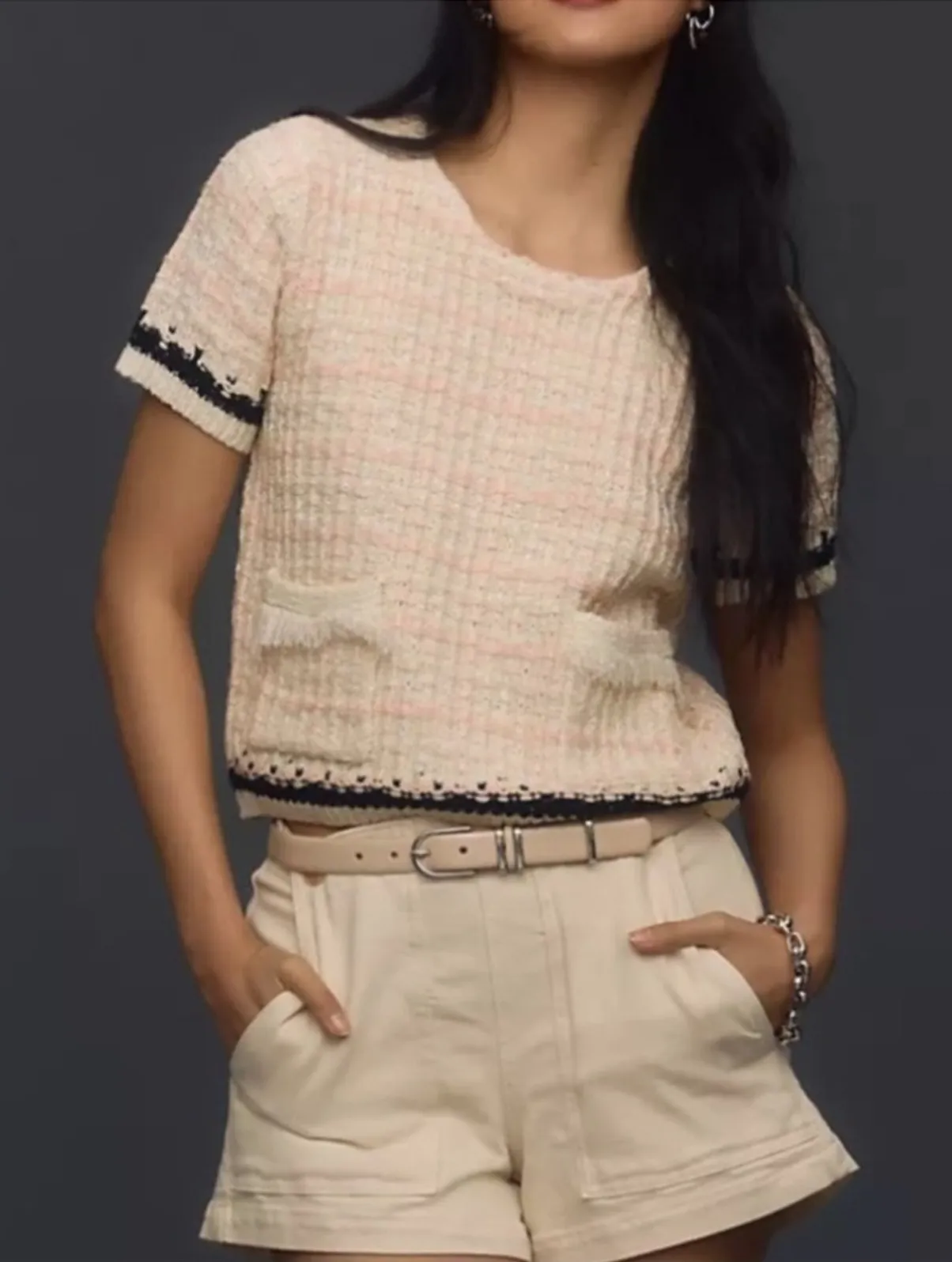Anthropologie Tweed Sweater Tee Size XS Pink peachy with fringe pockets Soft Girl Feminine girly p... Show more