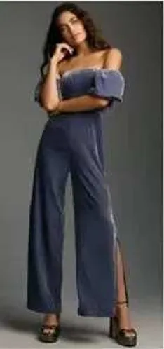 Keywords: Anthropologie, The Femme, velvet jumpsuit, blue jumpsuit, off shoulder, wide leg, occasion jumpsuit, party jumpsuit, ruched, size 10, women's jumpsuit, boho style, elegant jumpsuit, romantic, feminine, winter