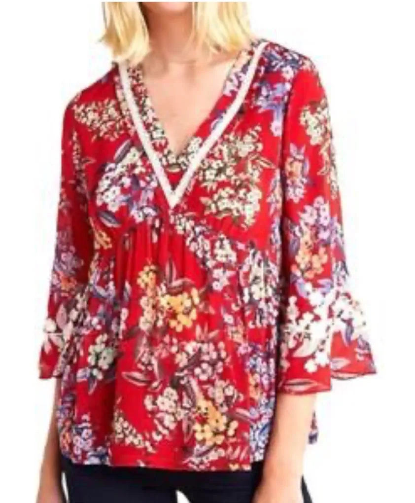 Red floral printed blouse from VINEET Bahl for Anthropologie. V-neck Bell sleeves Embroidered deta... Show more