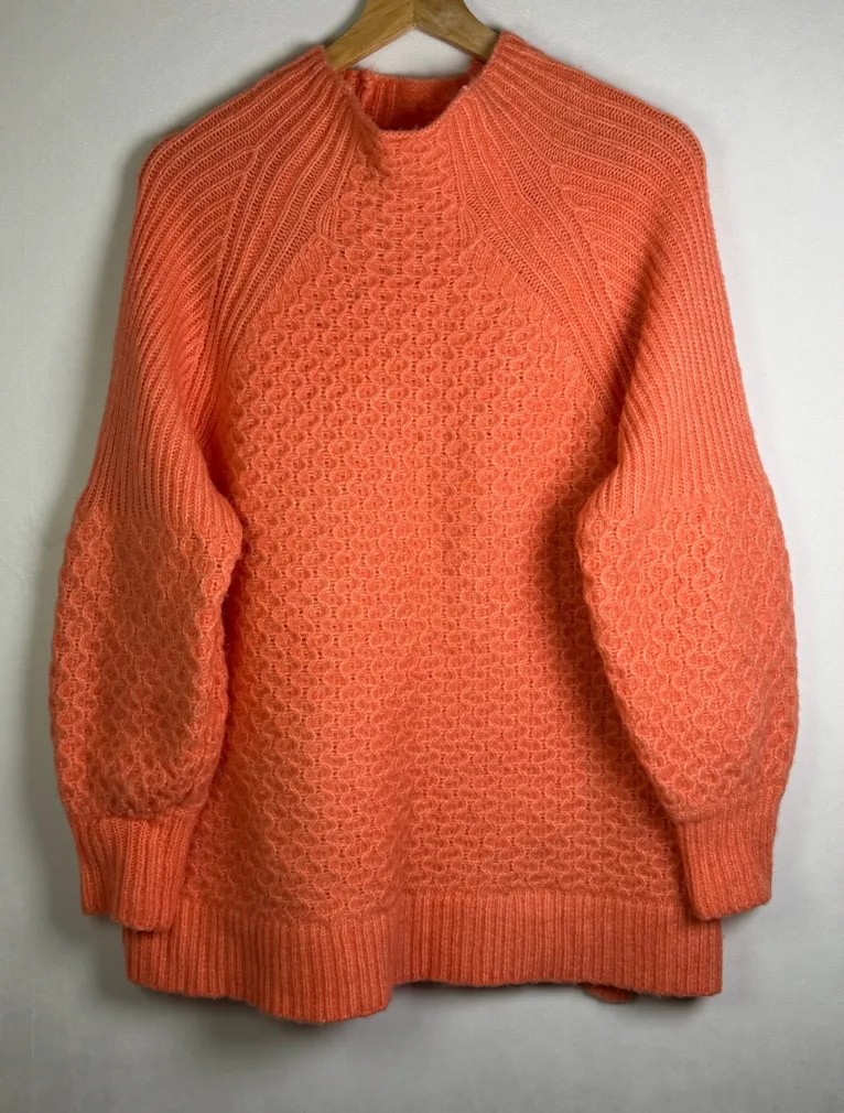 Anthropologie sweater, Bia mock neck sweater, oversized tunic sweater, textured knit sweater, alpaca blend sweater, cozy fall sweater, mock neck knit, chunky sweater, boho sweater, modern minimalist sweater, relaxed fit sweater, boutique sweater, Anthropologie knitwear, coral sweater, peach sweater, layering sweater