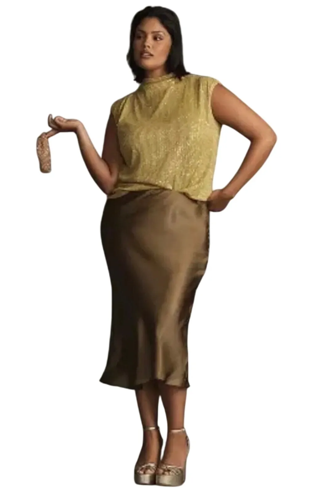 ANTHROPOLOGIE Women’s Liquid Shine Bias Cut Dark Champagne Midi Skirt Pull on elastic waist 100%... Show more