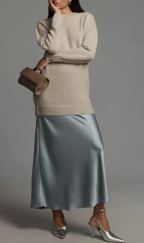 Anthropologie Women’s Long Sleeve Twofer Taupe Sweater Blue Slip Midi Dress Size Small Good preown... Show more