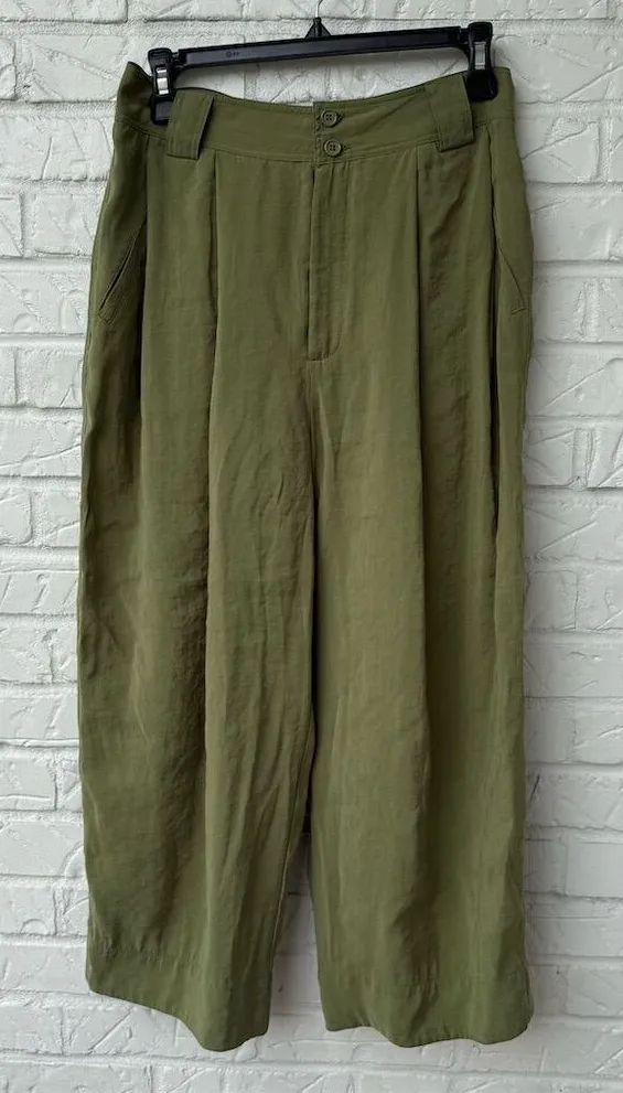These women's wide-leg pants by Anthropologie are size 4 and come in a solid green color. Made from 82% modal and 18% polyester, they feature an elastic high waist, side pockets, a button and zip closure, and a pleated front. Designed for casual occasions, these pants offer a regular fit and are machine washable. Manufactured in Turkey, they are pre-owned excellent condition. Brand: By Anthropologie Size: 4 Type: Pants Style: Wide-Leg Color: Green Department: Women Material: 82% Modal, 18% Polyester Leg style: Wide-Leg Features: Elastic High Waist, Side Pockets, Button and Zip Closure, Pleated Front Closure: Zip Pattern: Solid Fit: Regular Occasion: Casual Country/region of manufacture: Turkey Garment care: Machine Washable Flat measurements: Waist: 14” Hips: 20” Rise: 12.5” Inseam: 21” 0937