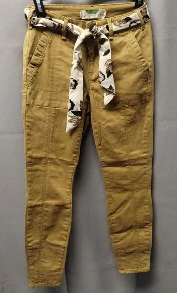 Features a skinny jean style with a floral/leave designed cloth belt. Measurements are inseam 26", w... Show more