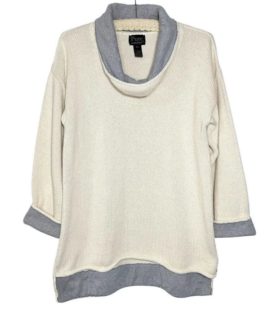 Anthropologie x Pure Hand Knit M/L Sweater High Low Cowl Neck Jersey Trim Excellent condition Sleeves roll up or down Tunic length in the back See photos for approximate measurements (taken lying flat without stretching). Ships within 24 hours Tags: Cozy, Comfy, Soft, Versatile, All Seasons, Timeless, Easy To Wear, Dress Up Or Down, Modest, Contemporary, Minimalist, Casual, Errands, Office, Flattering, Closet Staple, Capsule Wardrobe, Quality Designer, Preppy