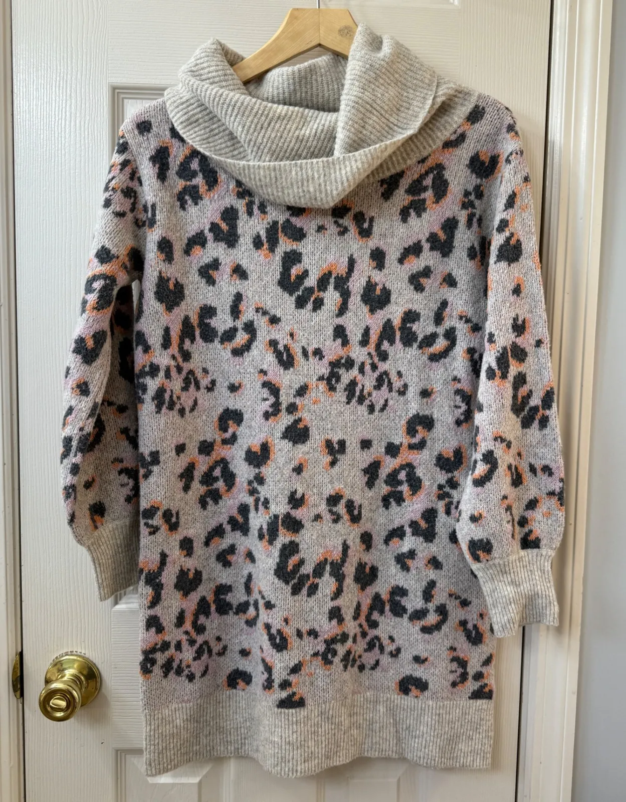 Keywords: Anthropologie, sweater dress, mini dress, leopard print, cowl neck, knit dress, grey dress, womens dress, casual dress, winter dress, fall dress, xs dress, extra small dress, long sleeve dress, animal print dress