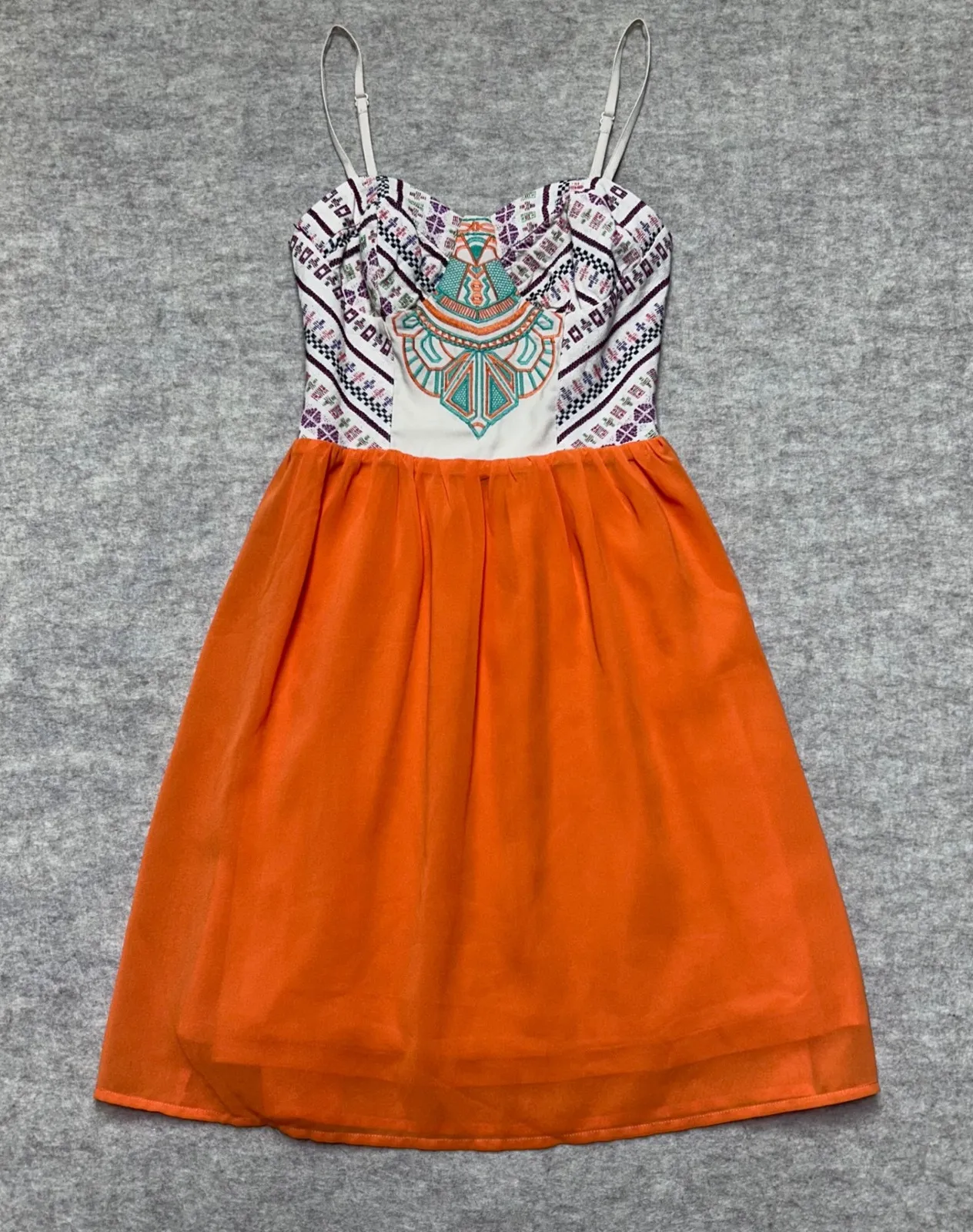 Fun and vibrant mini dress perfect for warm weather. Featuring a unique, colorful patterned bodice with intricate detailing and adjustable straps, this dress flows into a bright orange skirt that adds a playful touch. The smocked bodice offers a comfortable and flattering fit. Ideal for a casual day out, a summer party, or a beach vacation.