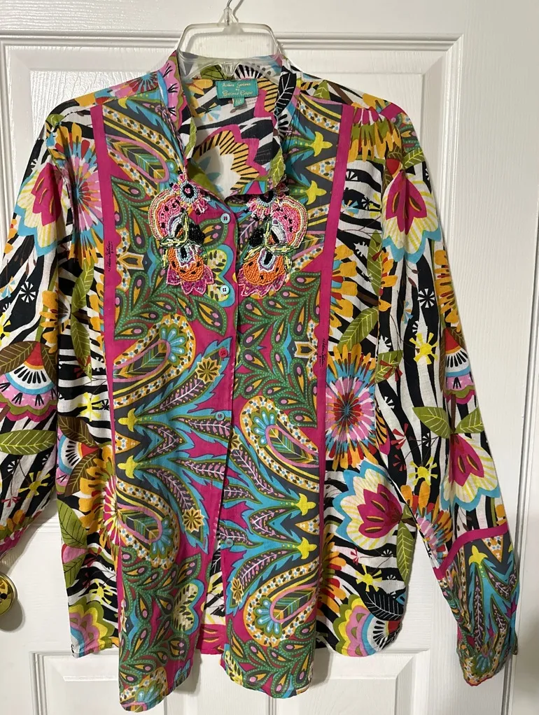 Antica Sartoria Comfort Shirt . This is marked OS but please look at the measurements below this brand runs all over the place in their sizing, good preloved condition. The comfort shirt by Giacomo Cinque, in 100% cotton, is a versatile model, bead designs to remark the beauty, perfect for completing your outfit on the beach and for long relaxing walks. The quality fabric, comfortable and breathable, features a print and bright colors in perfect Positano beachwear style. The wide sleeves and asymmetrical cut give charm and elegance. Please see pictures as part of condition and measurements and ask any questions 23” from underarm to underarm
