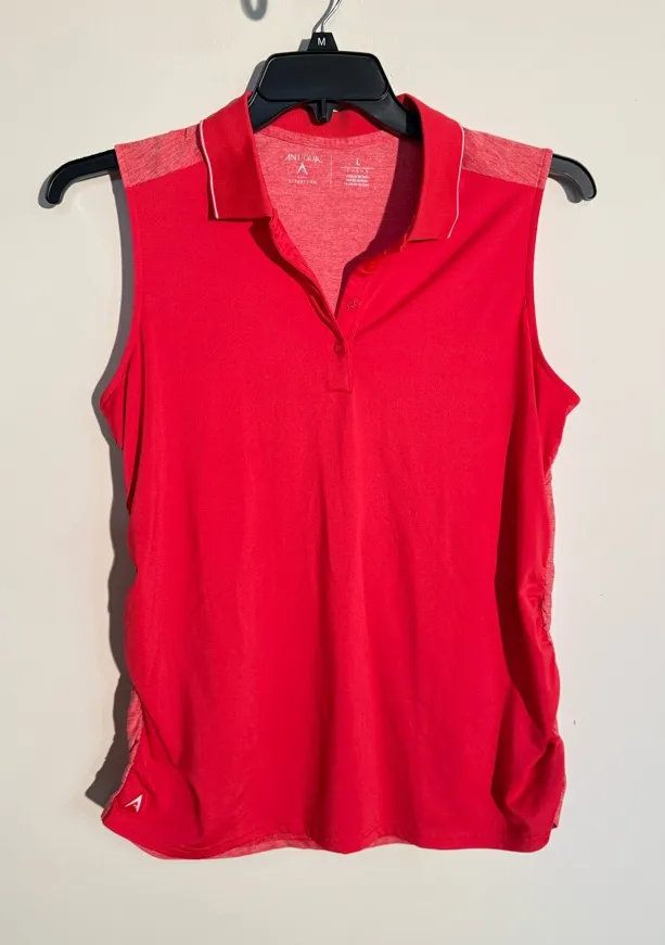 Stay cool and stylish on the course with this Antigua sleeveless golf polo. Featuring a bright red color with contrast heathered shoulders, this top offers a sporty, breathable design that’s perfect for warm weather play. Lightweight, stretchy fabric allows easy movement, and the classic polo collar adds a polished, athletic look. Condition: Excellent pre-owned Brand: Antigua Size: Large Color: Red with heathered accents Style: Sleeveless golf polo / active tank Features: • Lightweight performance fabric • Button-up polo neckline • Sleeveless design for full range of motion • Subtle Antigua logo at hem • Breathable and comfortable for active wear Perfect for: Golf, tennis, outdoor workouts, warm weather activities, casual athletic outfits. Keywords: Antigua top, women’s golf shirt, golf tank, sleeveless polo, red polo tank, performance top, activewear, athletic tank, country club style, sporty sleeveless top, golf apparel, moisture-wicking top, summer workout shirt, ladies golf clothing, Antigua golf.
