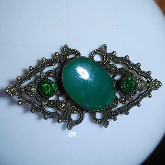 Green centerpiece cabochon is flawed glass is cracked This vintage brooch exudes timeless elegance... Show more