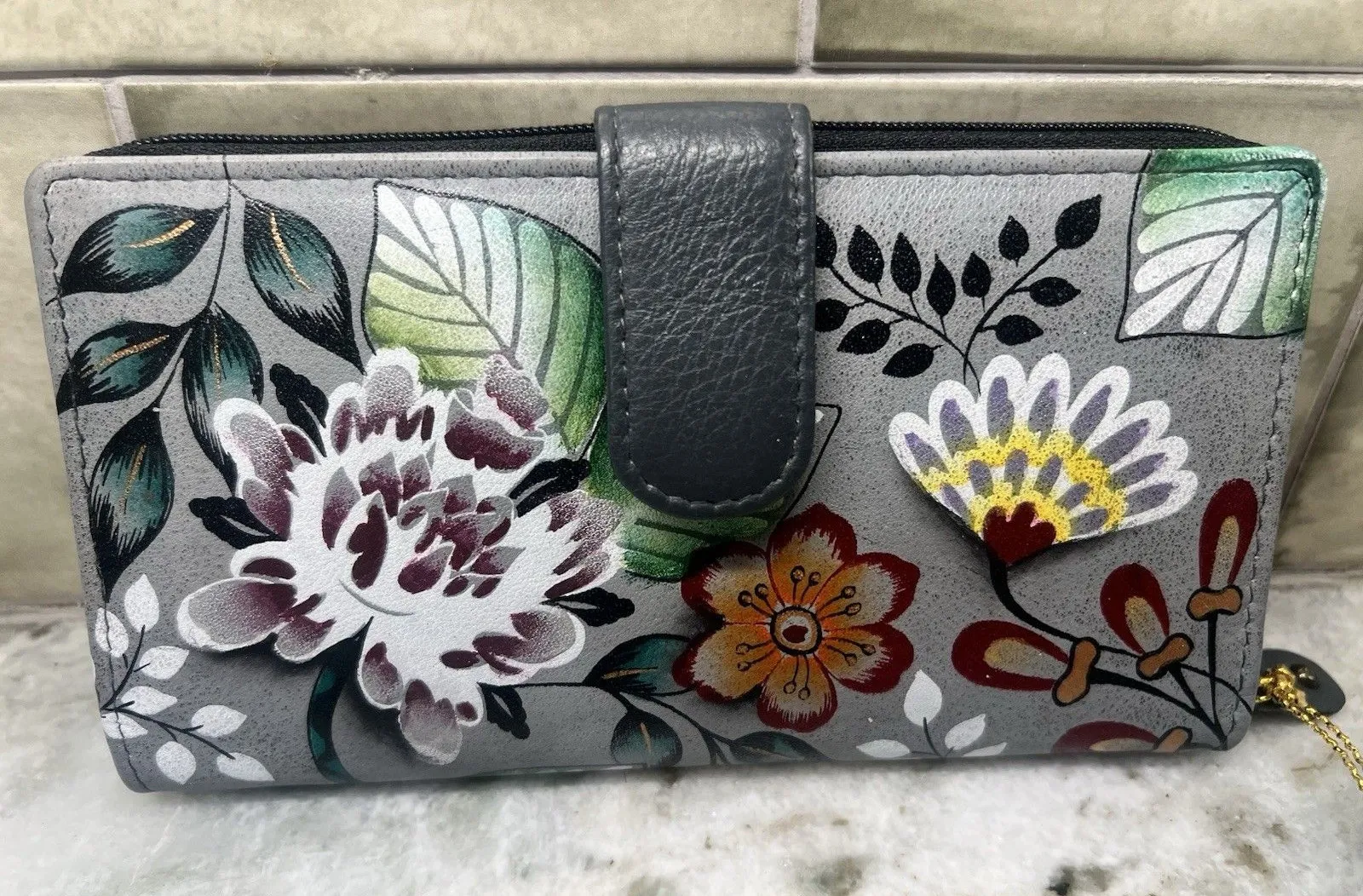 Beautiful hand painted wallet. The Anuschka Women's Hand Painted Wallet features a beautiful floral design with gray green leaves, adding a touch of elegance to any outfit. This wallet is perfect for women who appreciate unique and detailed accessories. With multiple credit card slots, a coin pouch, and a convenient zip closure, this wallet offers both style and functionality. The intricate hand-painted details make this wallet a standout piece for any wardrobe, while the multicolor design adds a pop of interest to the overall look.