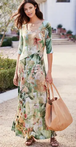 This elegant A-line maxi dress from Soft Surroundings features a scoop neckline and cuffed 3/4 sleeves, perfect for resort wear. The flowing silhouette is adorned with a beautiful blend of green and pink hues, creating a watercolor-like floral pattern that exudes a casual yet sophisticated charm. Size PM 10-12 Pit to pit 20” Shoulder to bottom 54”