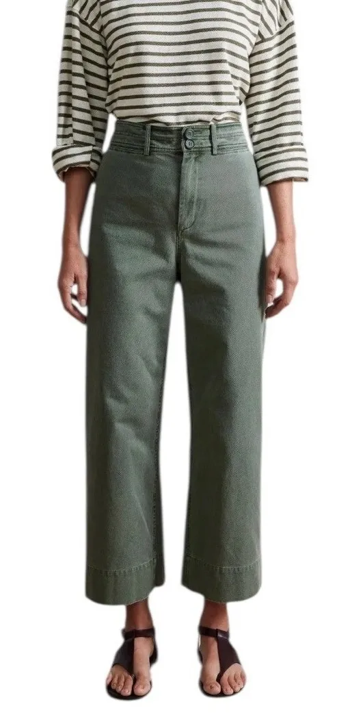 New with tags. No flaws. Smoke free home. A piece Apart Merida Chino Merida Pant in Thyme. High waisted wide leg cropped pants with a button fly and classic five pocket styling. Features a clean finish with a subtle hem detail. Style: Chino Department: Women Material: Cotton Leg Style: Wide-Leg Type: Pants Features: Pockets, Cuffed Closure: Button, Zip Pattern: Solid Accents: Button Fit: Relaxed Season: Spring, Summer, Fall Keywords: Apiece Apart, chino, wide leg, cropped, high rise, button fly, utility, classic, minimalist, tailored, workwear, sustainable