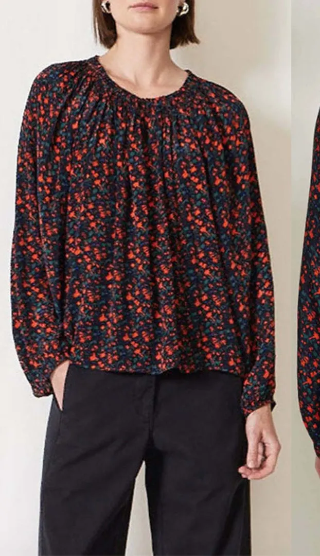 Apiece Apart Esparta Top. Lightweight non-stretch weave. Button keyhole and smocked elastic at round neckline. Long sleeves with elastic cuffs. Floral print. Black/red. Size small. Excellent pre-owned condition, no major flaws to note. Approximate measurements: Pit to pit: 23“ Length: 25.5“ N3.