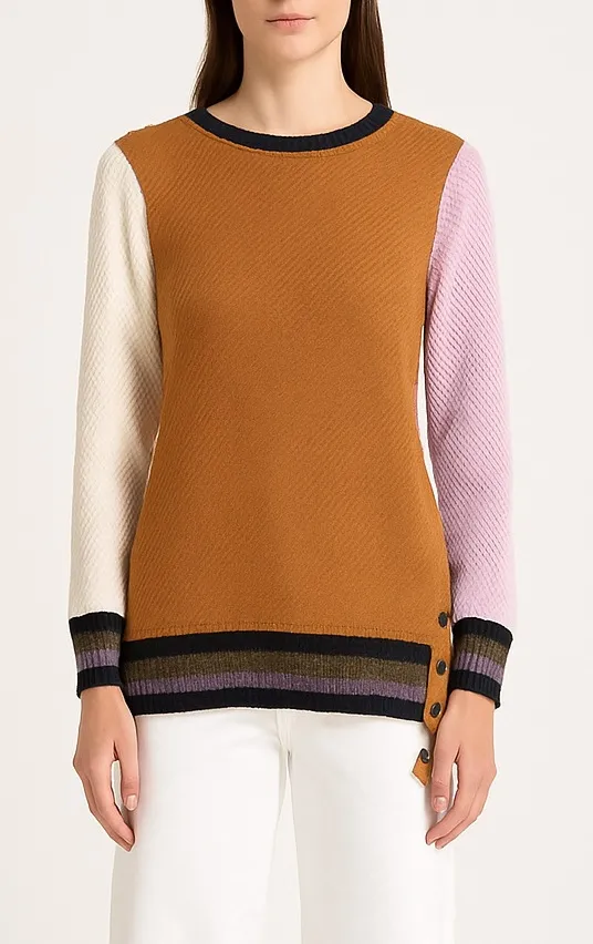 Apiece Apart Almeria Button Side Colorblock Sweater This luxe knit features a colorblock palette with a rich camel body, contrasting ivory and dusty rose sleeves, and striped ribbed cuffs and hem for an elevated finish. A signature detail is the functional side button placket, allowing for customizable styling and added flair. Size: Small Color: Camel, ivory, pink, black, and multi-color stripe Material: cotton blend Details: Crew neck, long sleeves, side button detailing, ribbed hem and cuffs Condition: Excellent pre-owned condition – no flaws to note