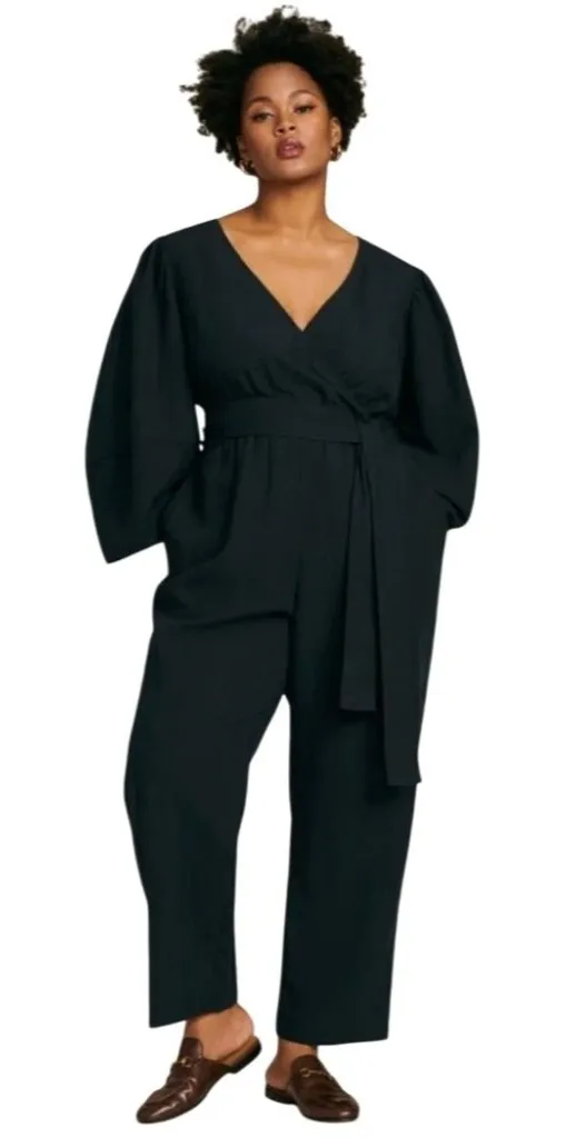 This tailored black jumpsuit features a sophisticated faux wrap-style design, functional pockets, an... Show more