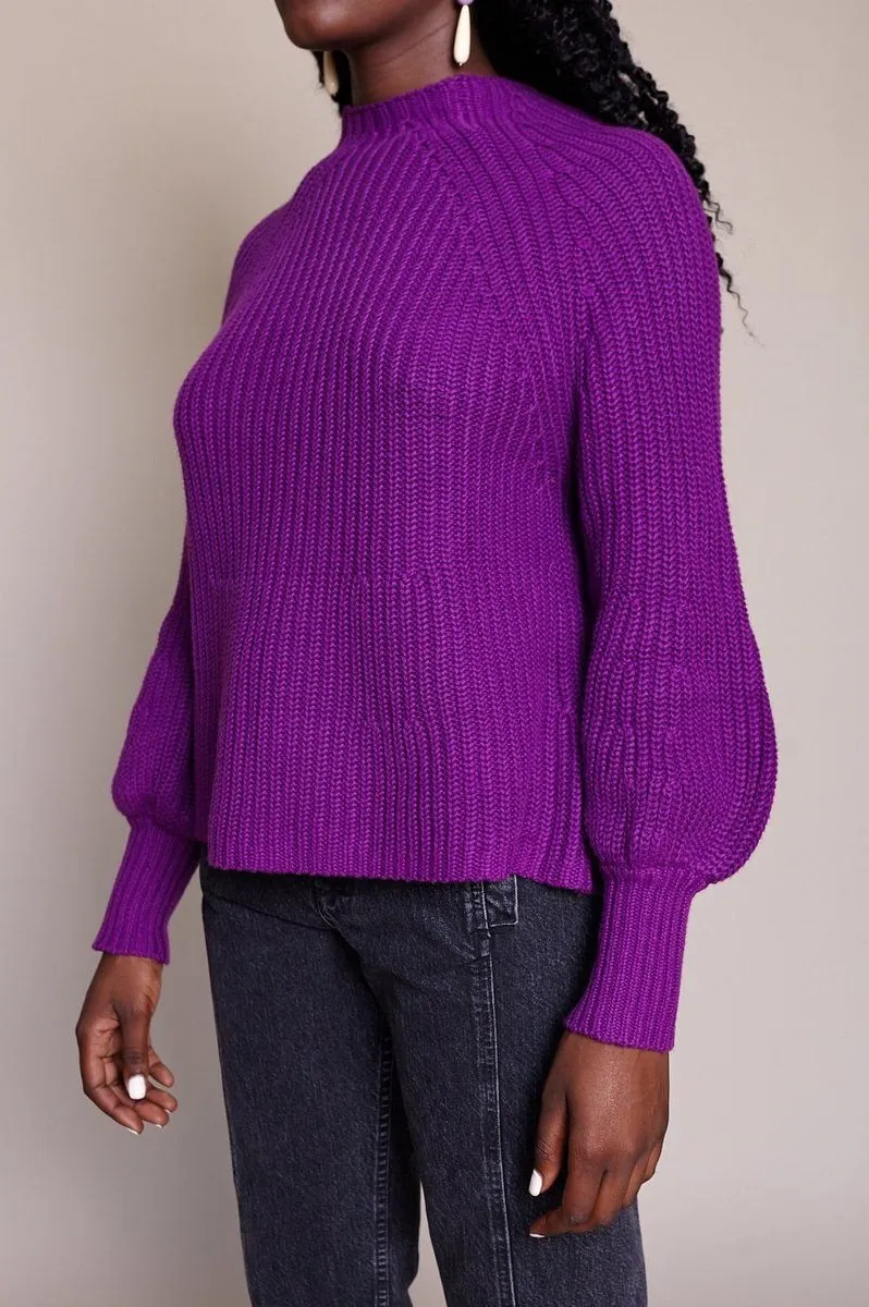 A sophisticated knit sweater in a vibrant purple hue. This garment showcases a flattering mock neckl... Show more