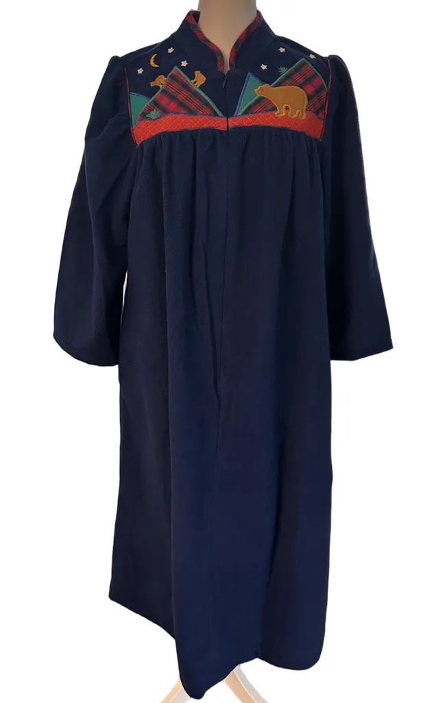 vintage navy blue housecoat or robe featuring a distinctive embroidered yoke with a bear and plaid design. These types of cozy, full-length robes or nightgowns with an embroidered top section were popular in the 1970s and 1980s.