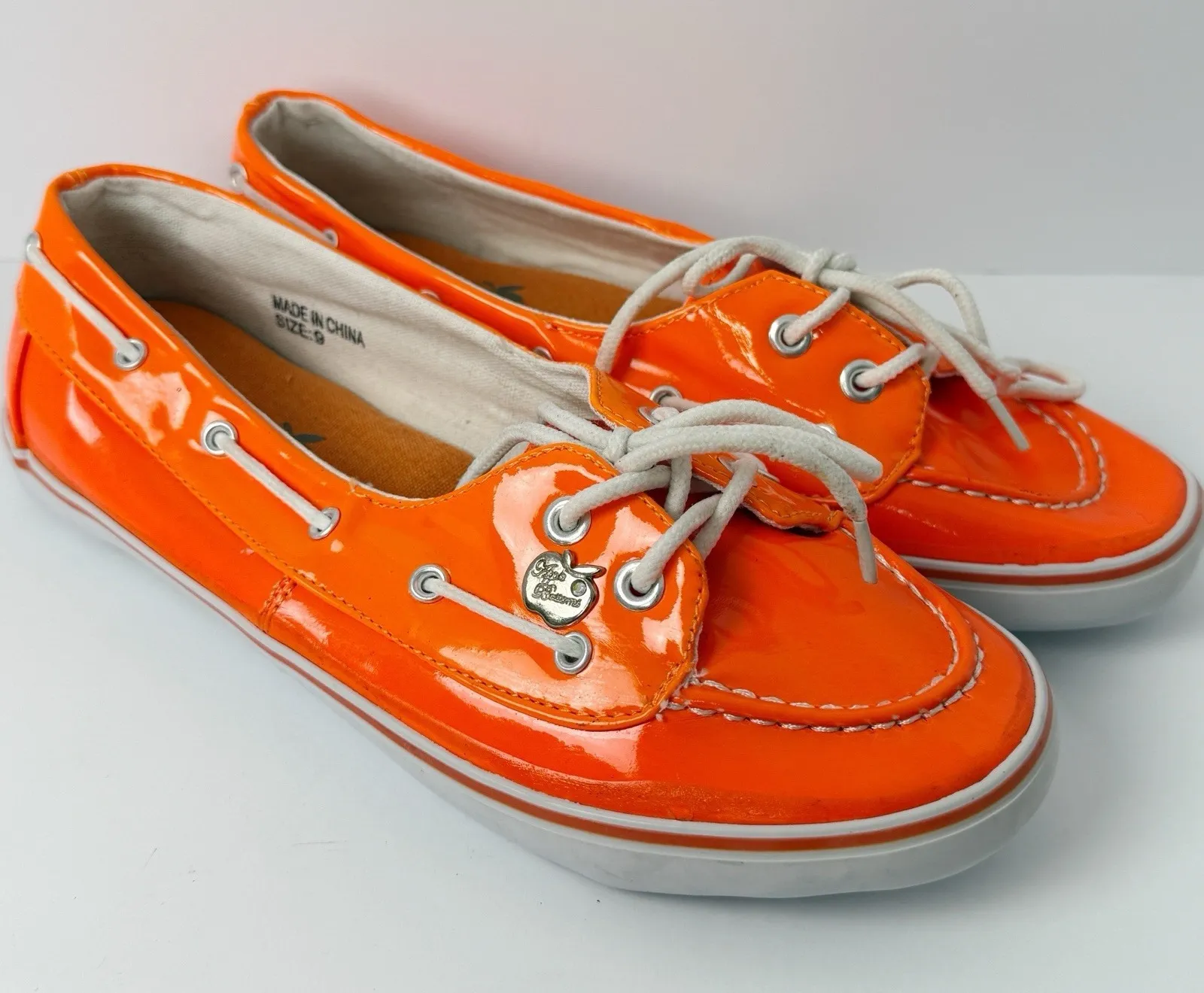 Classic early-2000s Y2K/vintage Apple Bottoms vibe. Features signature apple logo charm on the lace area and original printed insole logo. Production mark inside reads "Made in China SIZE 9." Stylish and bold — perfect for collectors of vintage early-2000s fashion or fans of the brand's comeback aesthetic. womens sneakers, casual shoes, 2000s style, hip-hop fashion, rap culture, Y2K outfit, vintage, nostalgia, neon orange, patent boat shoe