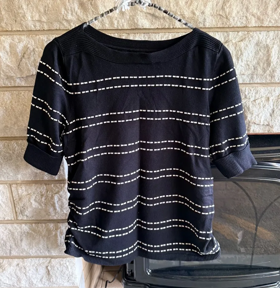 This Apt. 9 Boat Neck Black and White Striped Short Sleeve Sweater Top in size Large is a stylish an... Show more