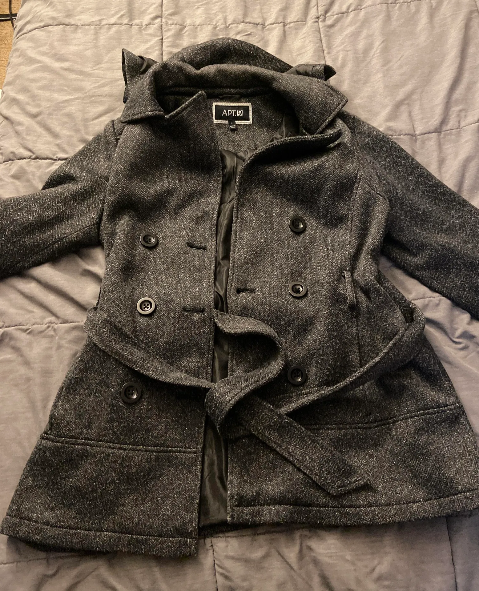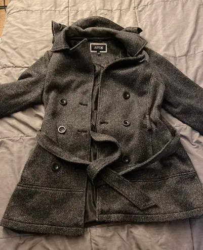 Size large dark gray apt 9 coat. Coat has pockets and the hood is removable with buttons. In good co... Show more