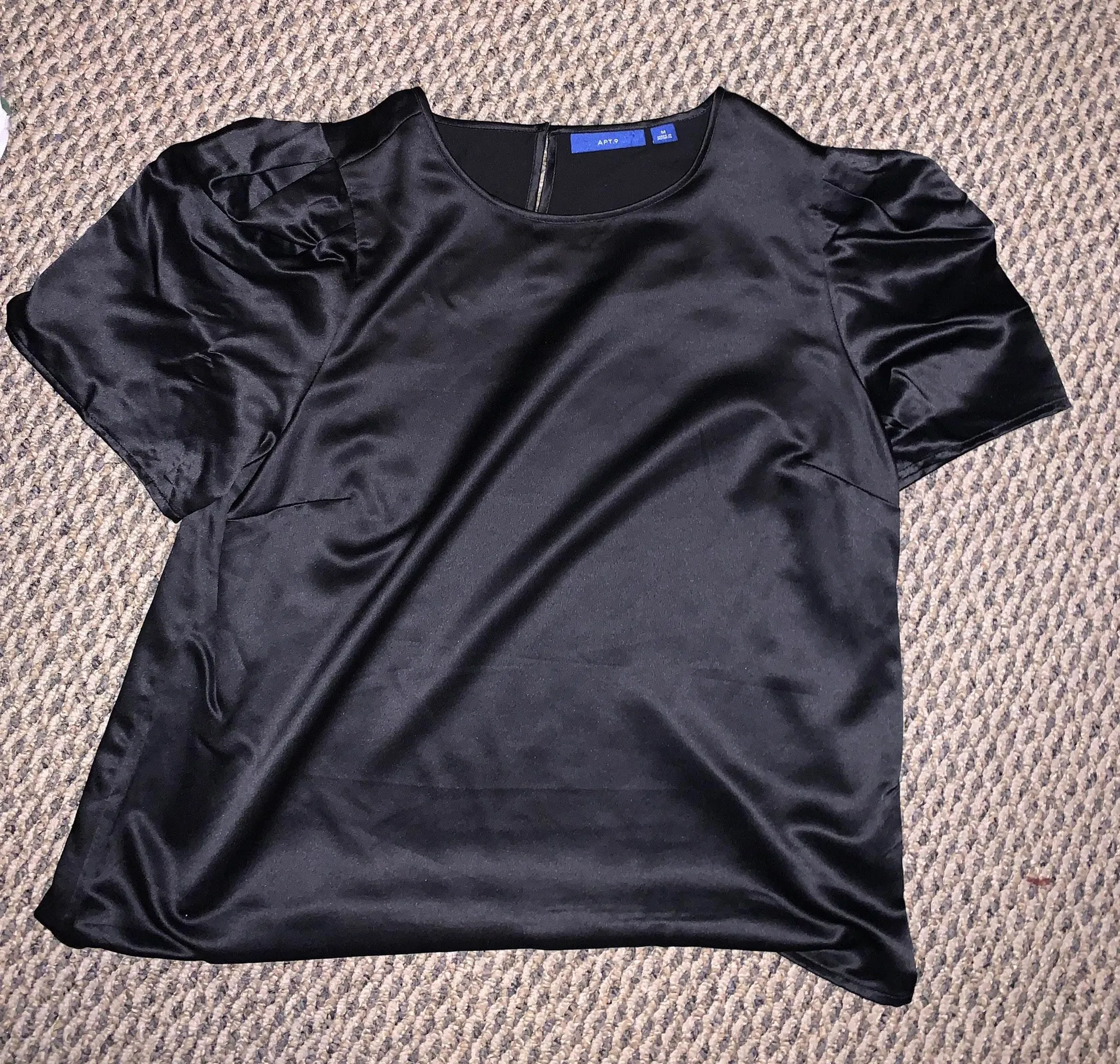 Black 100% polyester (but looks like silk) top. Size medium. Puffed shoulder sleeves. Perfect for an... Show more