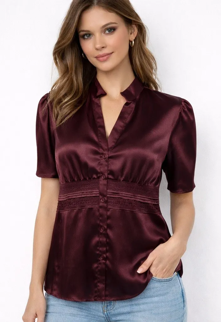 Command attention with this striking Apt 9 blouse, a captivating blend of luxurious satin and delicate lace. The rich burgundy hue exudes sophistication, while the V-neckline and elegantly gathered waist create a flattering silhouette. Short puff sleeves add a touch of romantic flair, and the subtle lace trim accents offer a refined detail that elevates this piece beyond the ordinary. Perfect for a romantic dinner date, a sophisticated evening out, or adding a touch of elegance to your work wardrobe. Measurements: • Bust: 27 in • Waist: 25 in • Length: 28 in • Shoulder to Shoulder: 17 in • Sleeve Length: 10 in Type: Blouse Department: Women Style: Basic Material: Polyester, Spandex Neckline: V-Neck Sleeve Length: Short Sleeve Sleeve Type: Puff Sleeve Pattern: Solid Accents: Button, Pleated Features: Lightweight Fit: Classic Fabric Type: Satin Occasion: Workwear, Party/Cocktail, Casual, Business Closure: Button Keywords: Apt 9 blouse, satin top, lace trim, burgundy shirt, plus size fashion, elegant top, feminine blouse, dressy casual, evening wear, date night outfit, work blouse, sophisticated style, short sleeve top