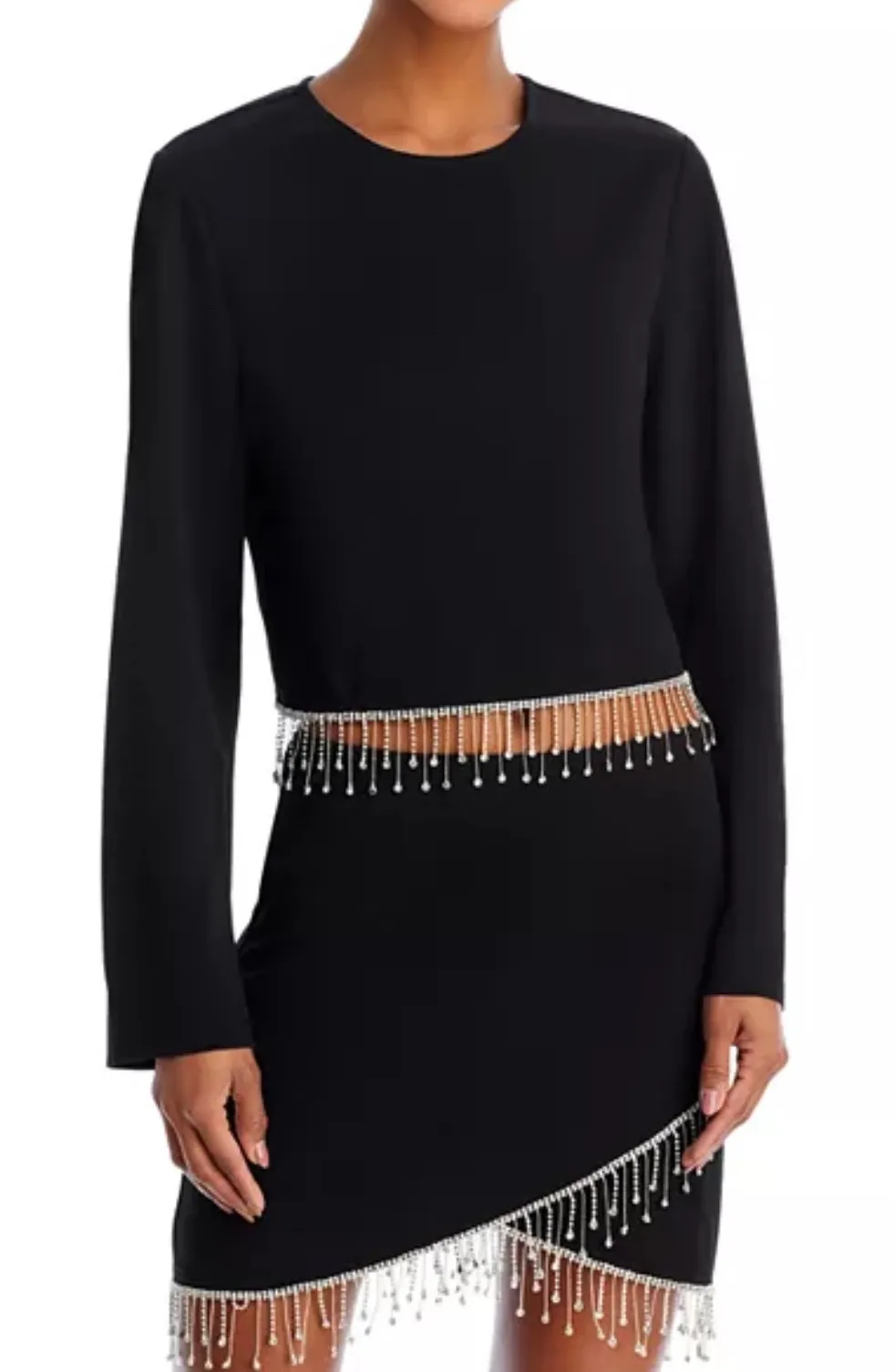 Keywords: black crop top, rhinestone fringe top, long sleeve top, party top, clubwear, womens top, Aqua top, evening top, statement top, sparkly top, dressy top, festival top, sexy top, xs top