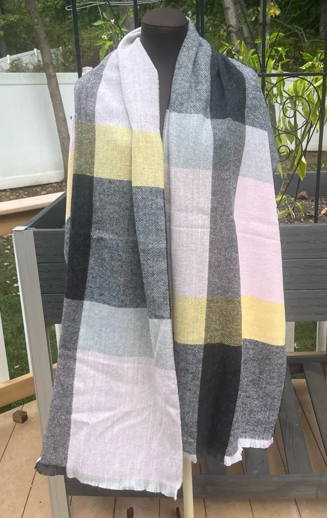 New with tags AQUA Bloomingdale’s Pink, Gray & Yellow Plaid Blanket Scarf with Fringe. Measures 24”x... Show more