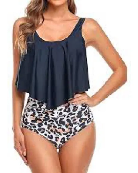 Stylish navy flounce bikini top paired with leopard print bottoms. Perfect for a chic beach look. Fabric type 85% Polyester, 15% Spandex Care instructions Hand wash or delicate cycle wash, air dry Origin Imported Closure type Elastic About this item Plus Size 2 Piece Swimsuits: This set includes a flounce bikini top and a high waisted bikini bottom. The ruffle details not only look very cute, but also enhance your shape. Plus Size Black Swimsuits for Women: Removable push up bras and adjustable shoulder straps give perfect support and modest fit. Plus Size Bathing Suits for Women: The flounce swim top helps to hide the belly with its tankini top design, while the high waisted swim bottom offers excellent tummy control. Plus Size Bikini Swimsuit: This plus size swimwear, made of soft fabric, is quick-drying, stretchy, and comfortable. It's perfect for women, teens, girls, ladies, mothers, and expectant mothers. Suitable for vacations, swimming pools, beaches, parties, and athletic sports. 5