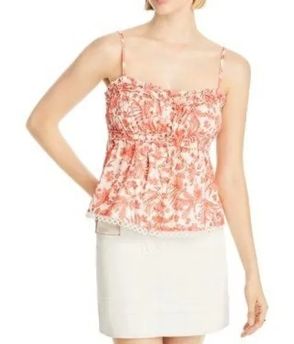 Keywords: AQUA, floral cami, sleeveless top, women's blouse, ruffle trim, spaghetti strap, smocked bodice, summer top, casual top, bohemian, floral print top, red and white, XL top