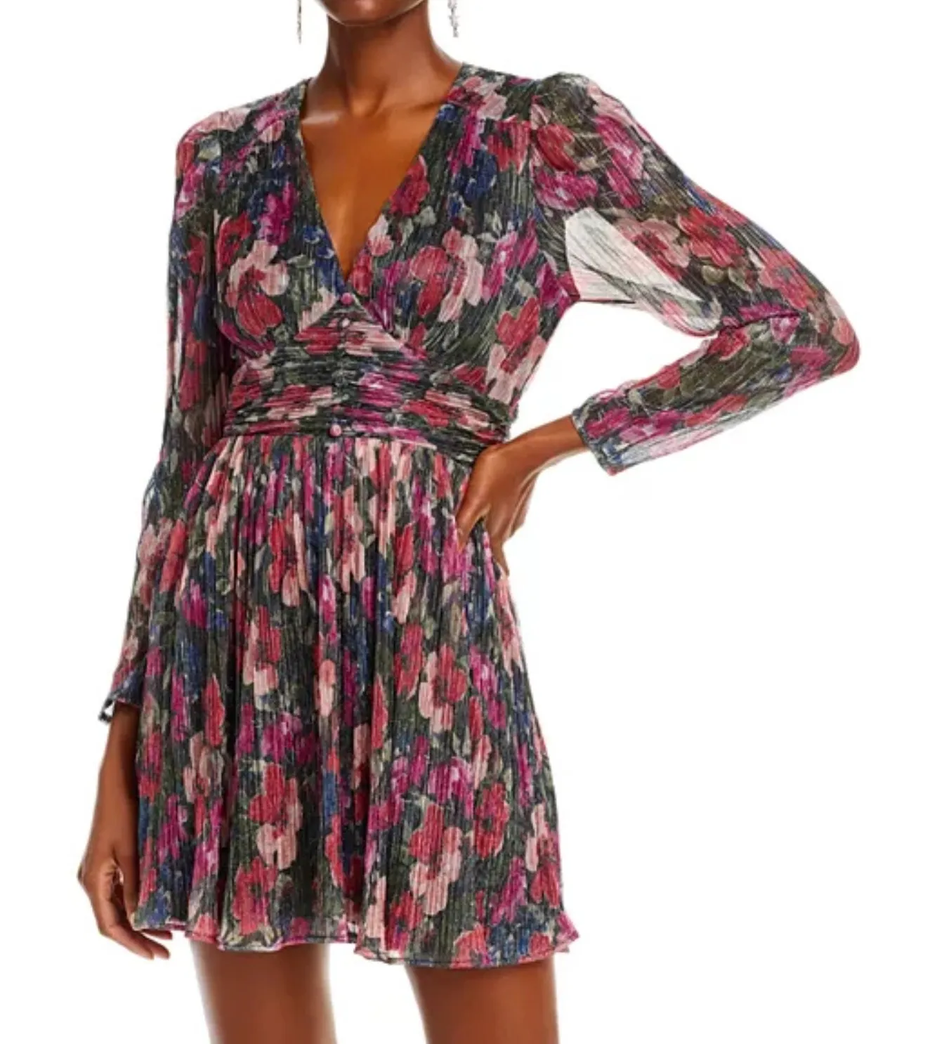 Enchanting floral mini dress captures attention with its romantic charm. A symphony of vibrant blooms dances across the silhouette, creating a captivating visual display. The flattering V-neckline and cinched waist enhance your figure, while the long sleeves add a touch of elegance. Delicate pleats cascade down the skirt, creating graceful movement with every step. This dress is perfect for a garden party, a cocktail event, or a romantic dinner date.
