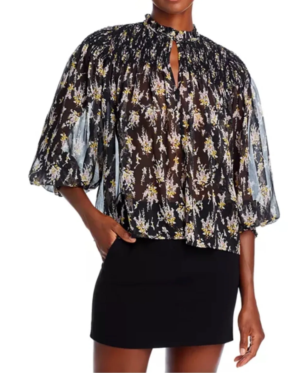 Romantic charm blooms in this AQUA blouse. A cascade of delicate floral patterns dances across the sheer black fabric, creating an ethereal and sophisticated look. Intricate smocking details adorn the mock neck and shoulders, adding a touch of texture and sophistication. The graceful, airy sleeves billow out to gather at the wrists with soft ruffles, creating a soft, elegant silhouette. A small keyhole opening at the neckline adds a hint of allure. This blouse is the perfect choice for a chic dinner date, a sophisticated garden party, or a day at the office when you want to feel put-together.