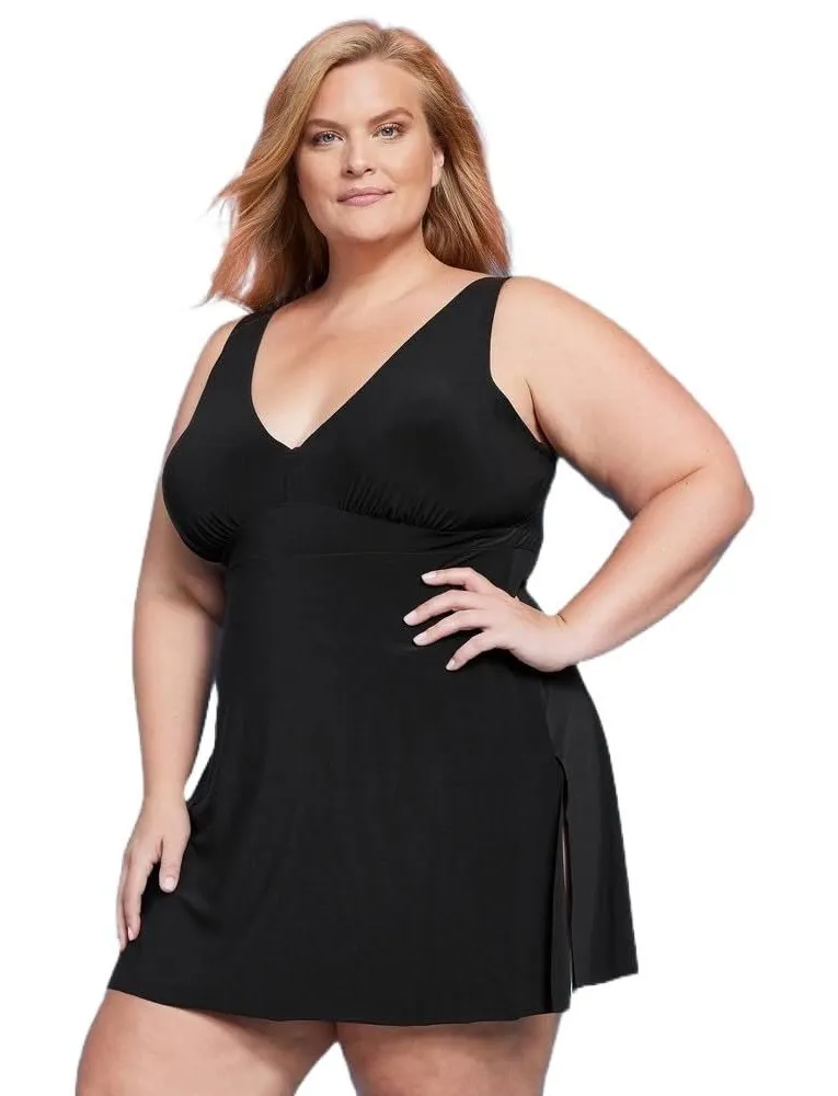Make a splash with this flattering black swim dress! This beautiful piece features a flattering V-neck and a figure-skimming design that accentuates your curves. With its built-in cups and adjustable straps, this swim dress offers comfort and support, allowing you to move freely and confidently. The flowy skirt provides coverage while still offering a touch of elegance. It's perfect for lounging by the pool, enjoying a beach vacation, or taking a dip in the ocean. Embrace your inner goddess and turn heads wherever you go! Type: Swimdress Color: Black Department: Women Material: Nylon, Spandex, Polyamide Swim Bottom Style: Swim Skirt Swim Top Style: Tank Features: Adjustable Straps, Built-In Bra, Tummy Control, Stretch, Comfortable Fit Pattern: Solid Accents: Strap Strap Type: Wide Strap Keywords: swim dress, bathing suit, swimsuit, black swim dress, plus size, 22W, aqua green, v neck, swimwear, beach, pool, vacation, cruise, summer, new with tags